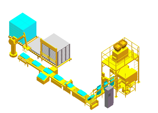 經(jīng)前面工序檢測合格的產(chǎn)品被輸送至碼垛輸送機,由碼垛機器人按設(shè)定好的碼垛方式自動包裝袋搬運到托板上,達到取代人工搬運、節(jié)約成本、提高勞動效益的目的。