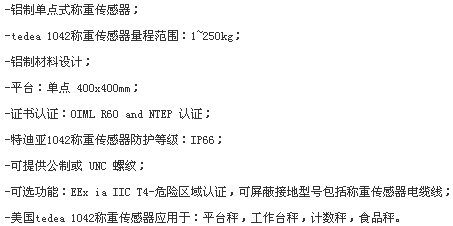 1042-50kg是鋁制單點式稱重傳感器,防護等級IP 66,支撐臺面:400X400mm,廣泛應用于平臺秤,工作臺秤,計數秤,食品秤等多個領域。(1042-50kg of aluminum single point weighing sensor, protection class IP 66, supporting the table: 400 x400mm, widely applied to the platform scale, work platform scales, counting scales, food scales and other fields.)