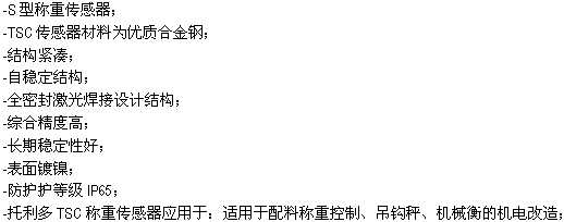 TSC-500kg稱重傳感器材料為優質合金鋼,長期穩定性好,應用于配料稱重控制、吊鉤秤、機械衡的機電改造等。(TSC-500kg weighing sensor material is high quality alloy steel, good long-term stability and application in the weighing control, hook scales, mechanical and electrical transformation of mechanical equilibrium, etc.)