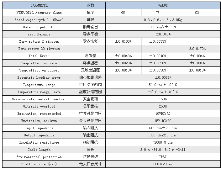 特迪亞1004-3KG稱重傳感器產品參數表: