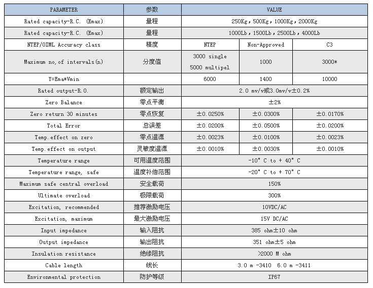 特迪亞3410-500KG稱重傳感器產(chǎn)品參數(shù)表: