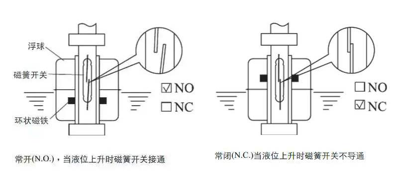 液位開關浮球液位開關是利用微動開關做接點輸出。當水平面以上揚線角度超過28°時,浮球液位開關內部的鋼珠會滾動壓到微