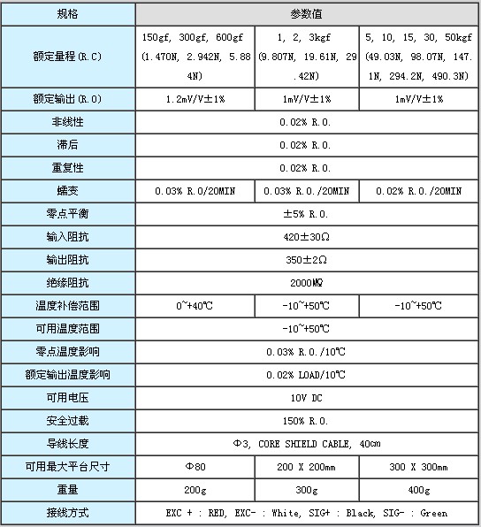 韓國Dacell CB1A-1kgf稱重傳感器技術參數: