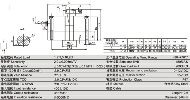 美國SUNCELLS LFSC-10T稱重傳感器參數尺寸: