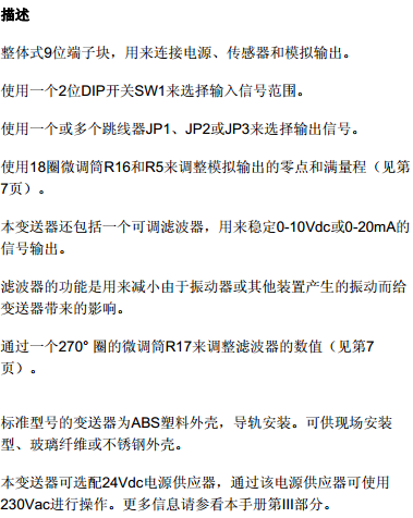 可 選:電源115/230 Vac 50/60 Hz;電源12Vdc ±15% (可輸出0-5Vdc);模擬濾波器響應(yīng)時間0.5ms~25ms