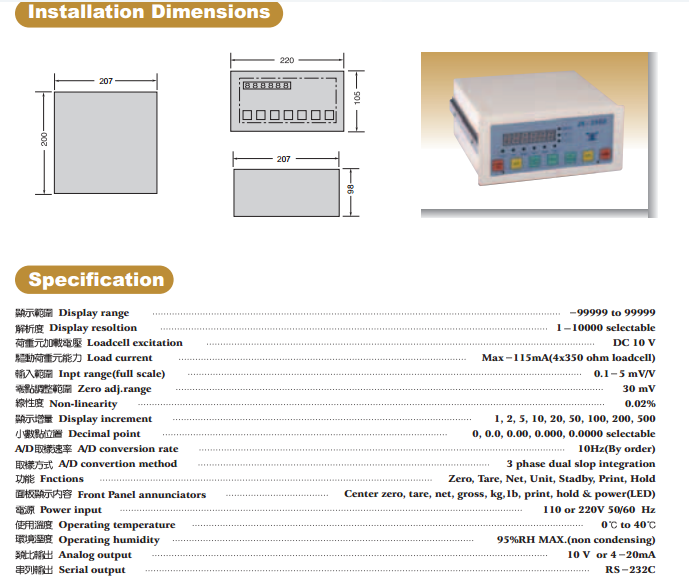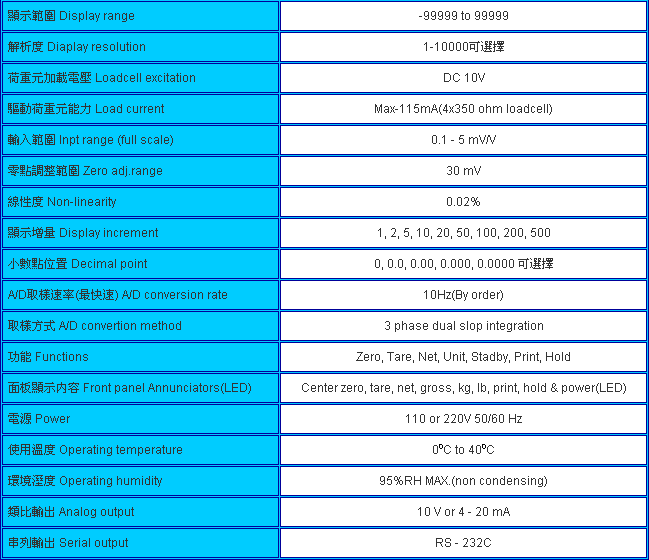 臺灣JIHSENSE JS-2200稱重顯示控制器規格: