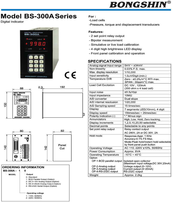 產品名稱:Bongshin BS-300A稱重儀表,韓國奉信BS-300A稱重顯示儀表
