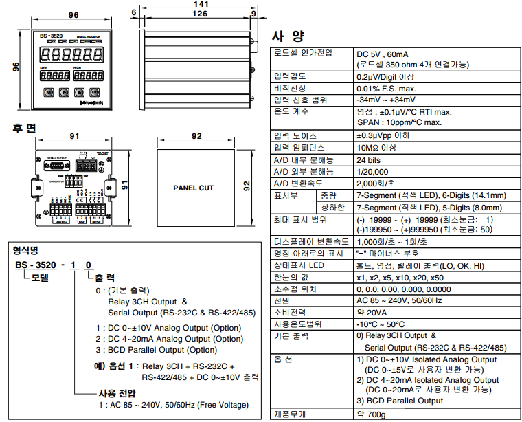 韓國Bongshin稱重傳感器,稱重顯示器BS-3520,奉信稱重儀表BS-3520高速顯示1,000次/秒,96×96(mm)尺寸,6位LED顯示(繼電器輸出三通)