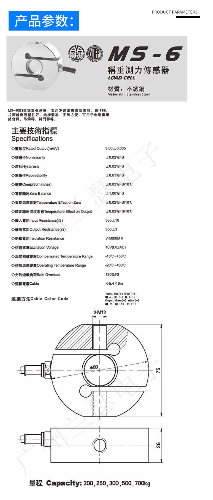 MS-6稱重傳感器采用不銹鋼焊接密封,達到IP68;拉、壓輸出對稱性好,結構緊湊,安裝方便,可用于制造機電結合秤、吊鉤秤、料斗秤等。