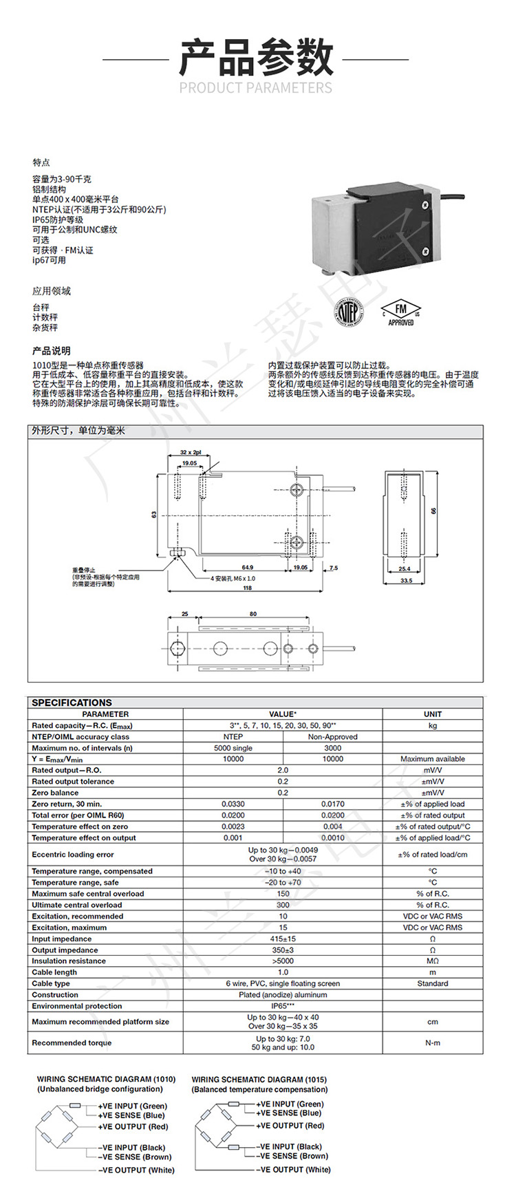 美國Tedea 1010-15kg,1010-20kg稱重傳感器產品參數: