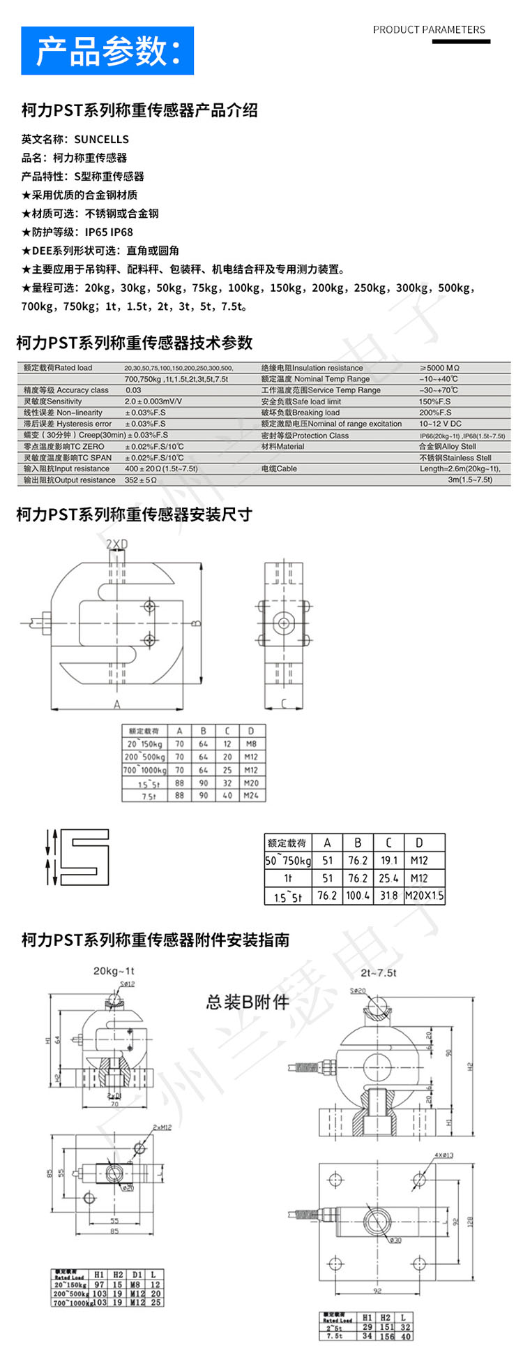寧波柯力 PST-300KG稱重傳感器產品參數:
