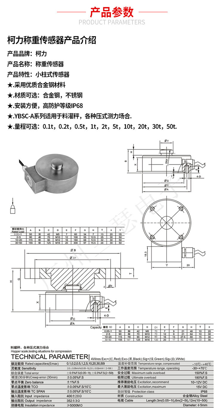 寧波柯力 YBSC-A-1t稱重傳感器產品參數: