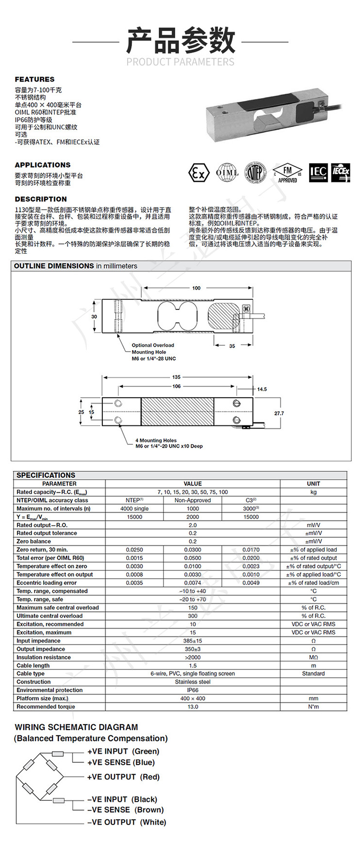美國Tedea 1130-10kg稱重傳感器產品參數: